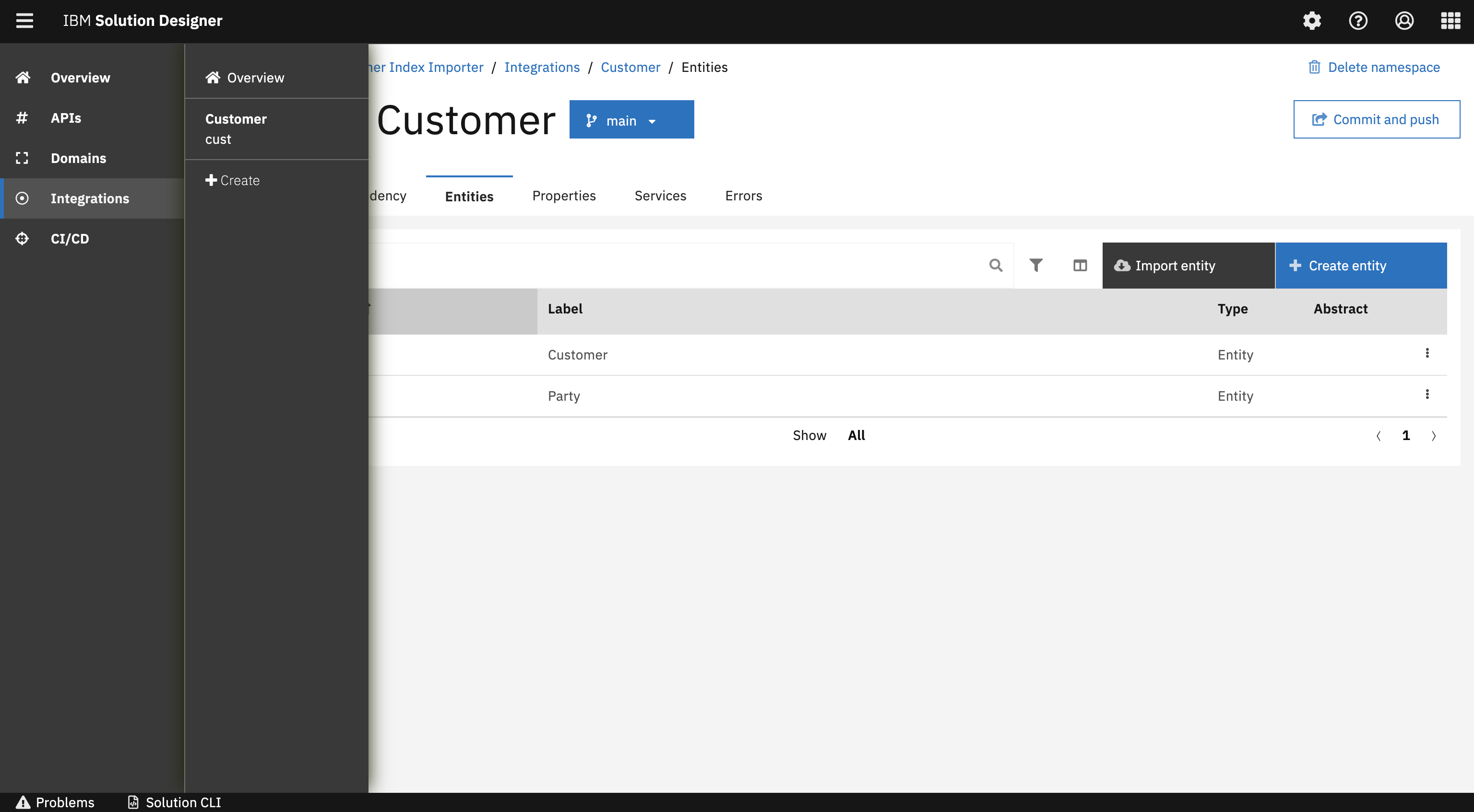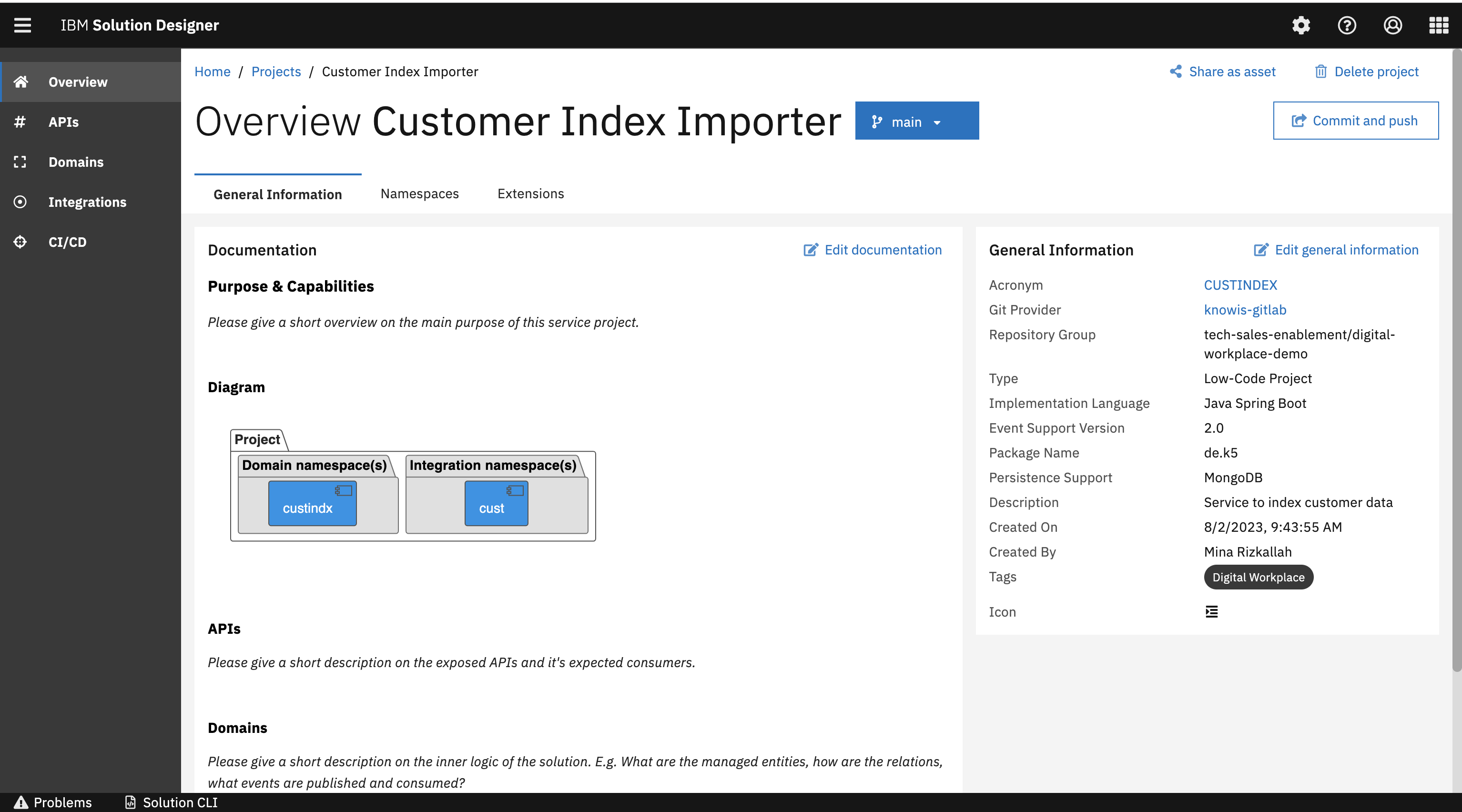 By taking the reference from the above, Adam and Jack have designed and built the service in the tool. The service contains different information CustomerIndex as Domain namespace and Customer as an Integration namespace. Since Julia is an experienced Java Spring Boot Developer, the service was built as a Java Spring Boot Low-Code.