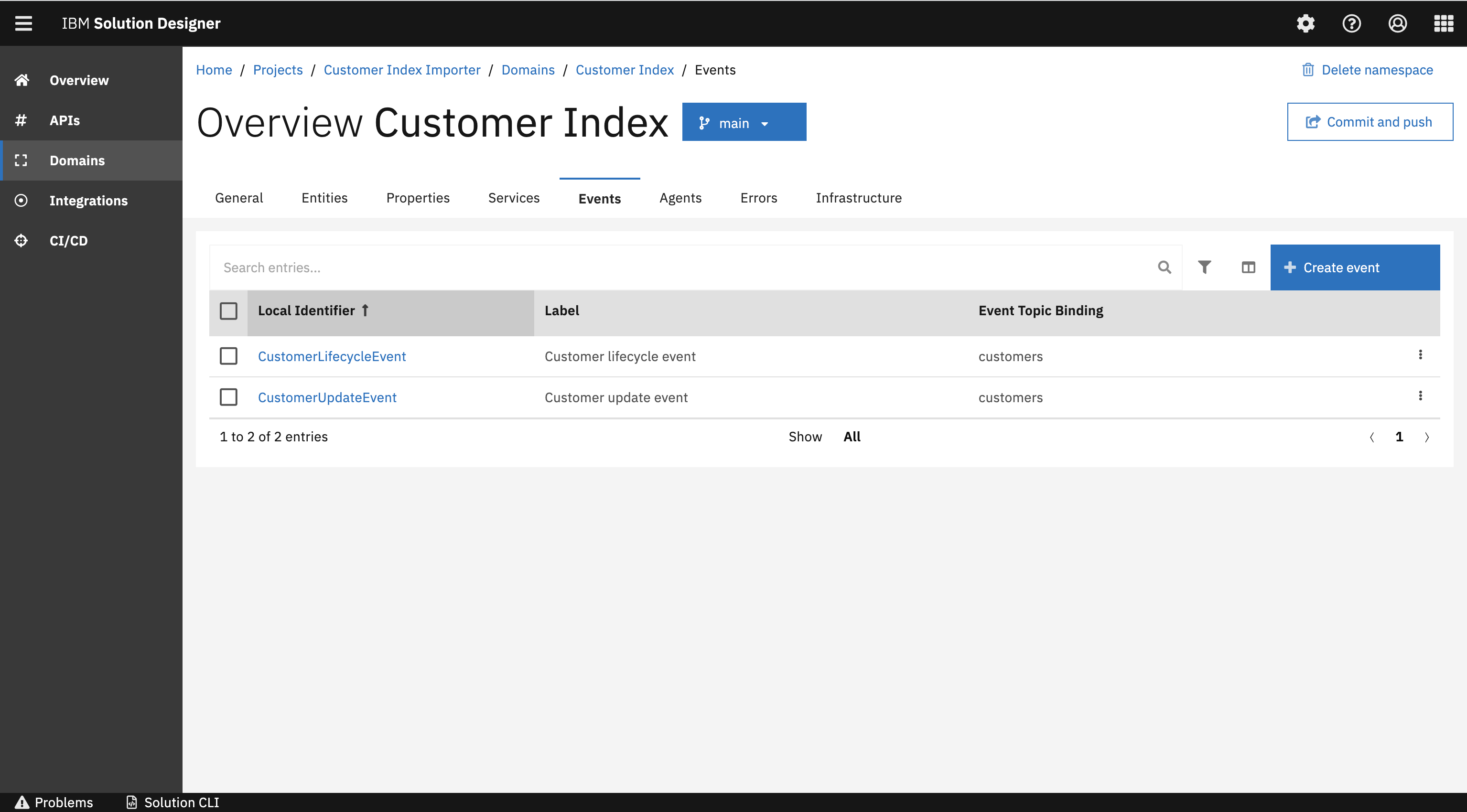 The Customer Index Importer Service has the domain namespace CustomerIndex. This domain namespace contain business events as CustomerLifecycleEvent and CustomerUpdateEvent which define that something has happened during the execution of business logic.