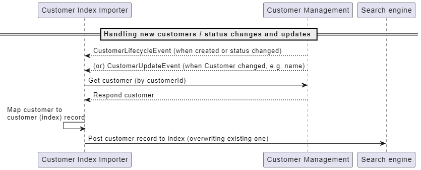 In Customer Index Importer Service the CustomerLifecycleEvent is used for the creation or a status change of a customer and the CustomerUpdateEvent is used for updating the customer data. The payload for both events contains the customerId, which is an important information for the agents.