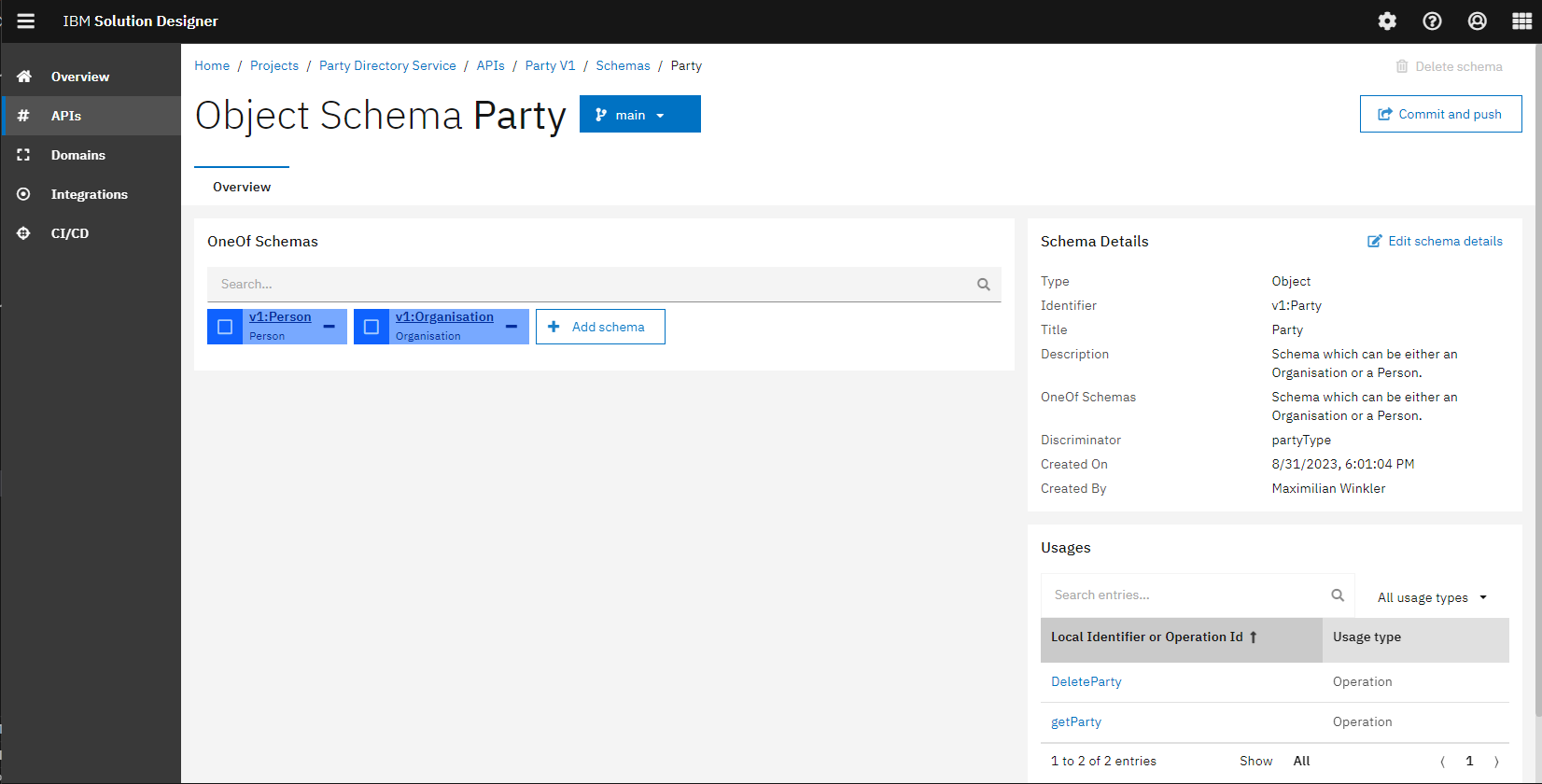 Alexander has also designed schemas within an API namespace. A schema represents a data type of an API. The API namespace of the Party service contains Object schemas as well as Array schemas. The party schema is designed as a oneof schema, it can either be person or organisation. A child schema with one value is designed for the person and the organization. The discriminator property then holds the child schema value to be able to differentiate between the two schemas.