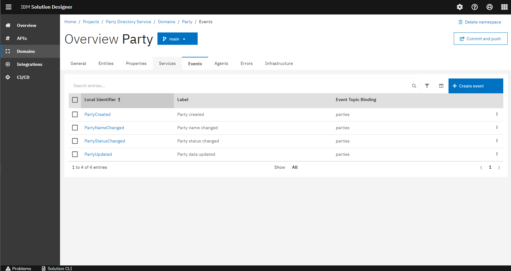 As you can see below, there are four events in the Party Service; PartyCreated, PartyNameChanged, PartyStatusChanged and PartyUpdated.