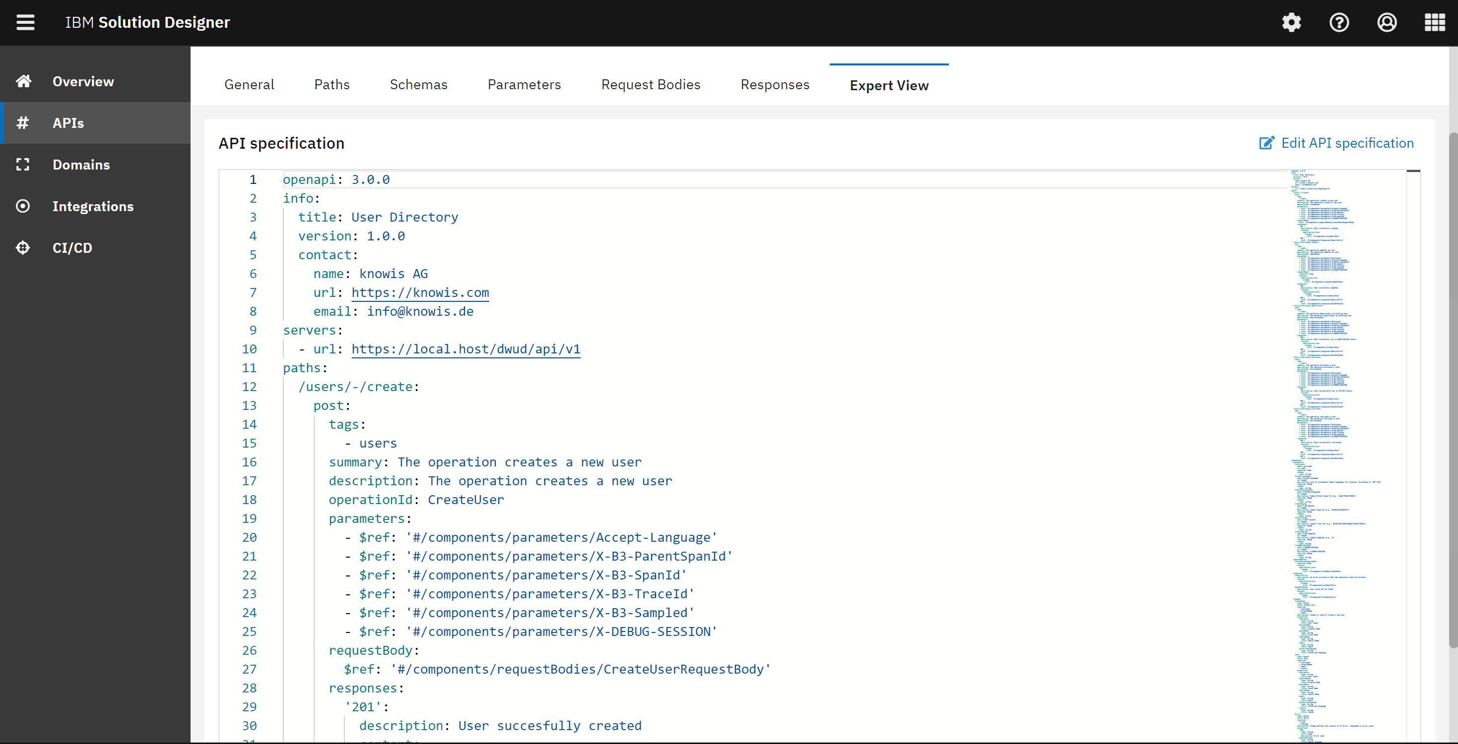 The Expert view displays the auto-generated OpenAPI 3 specification containing all of the components of the API Namespace, and it's a preview of how the generated specs will look like when committing the project to the git repository. The Expert view is accessed through the Expert view tab in the API Namespace.