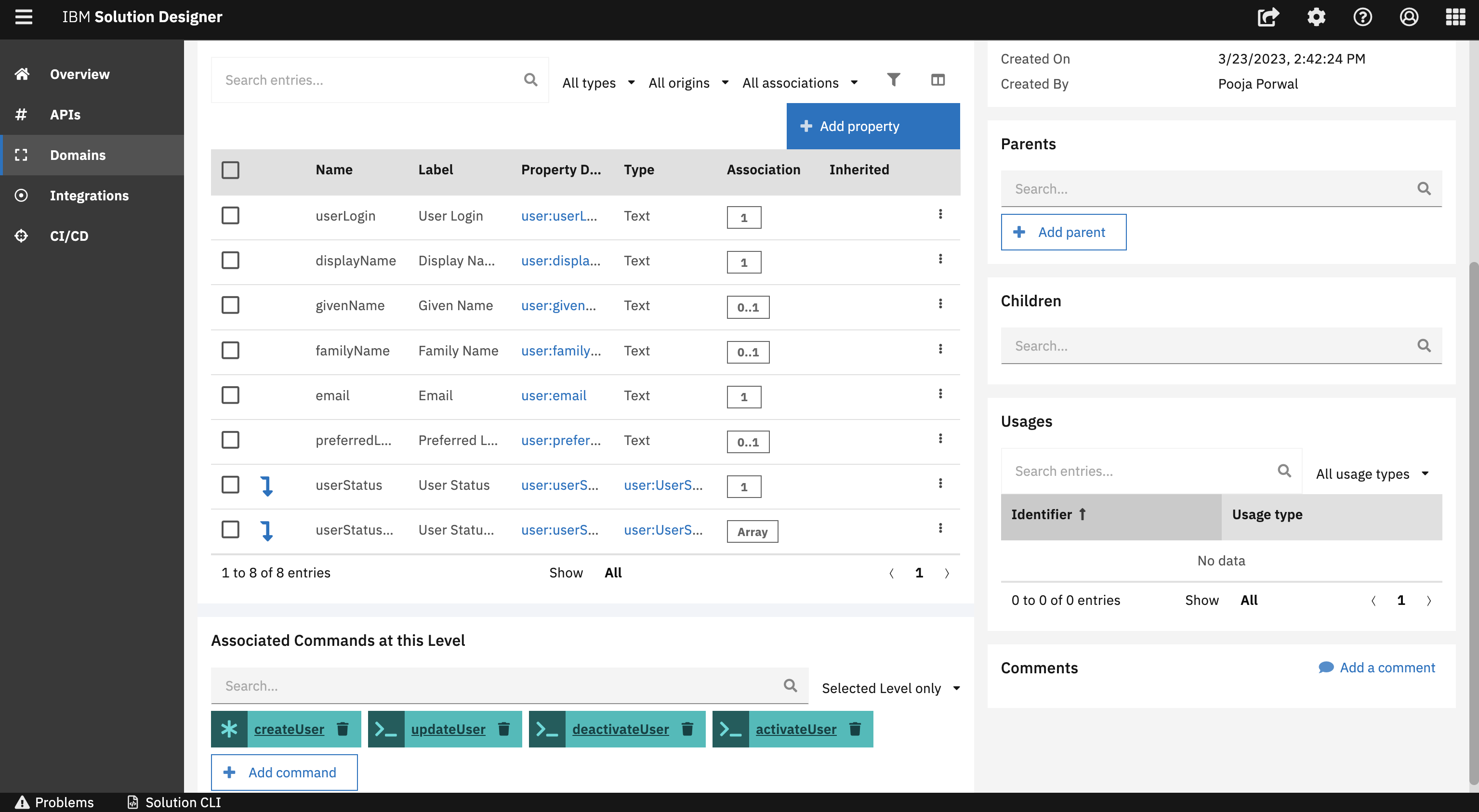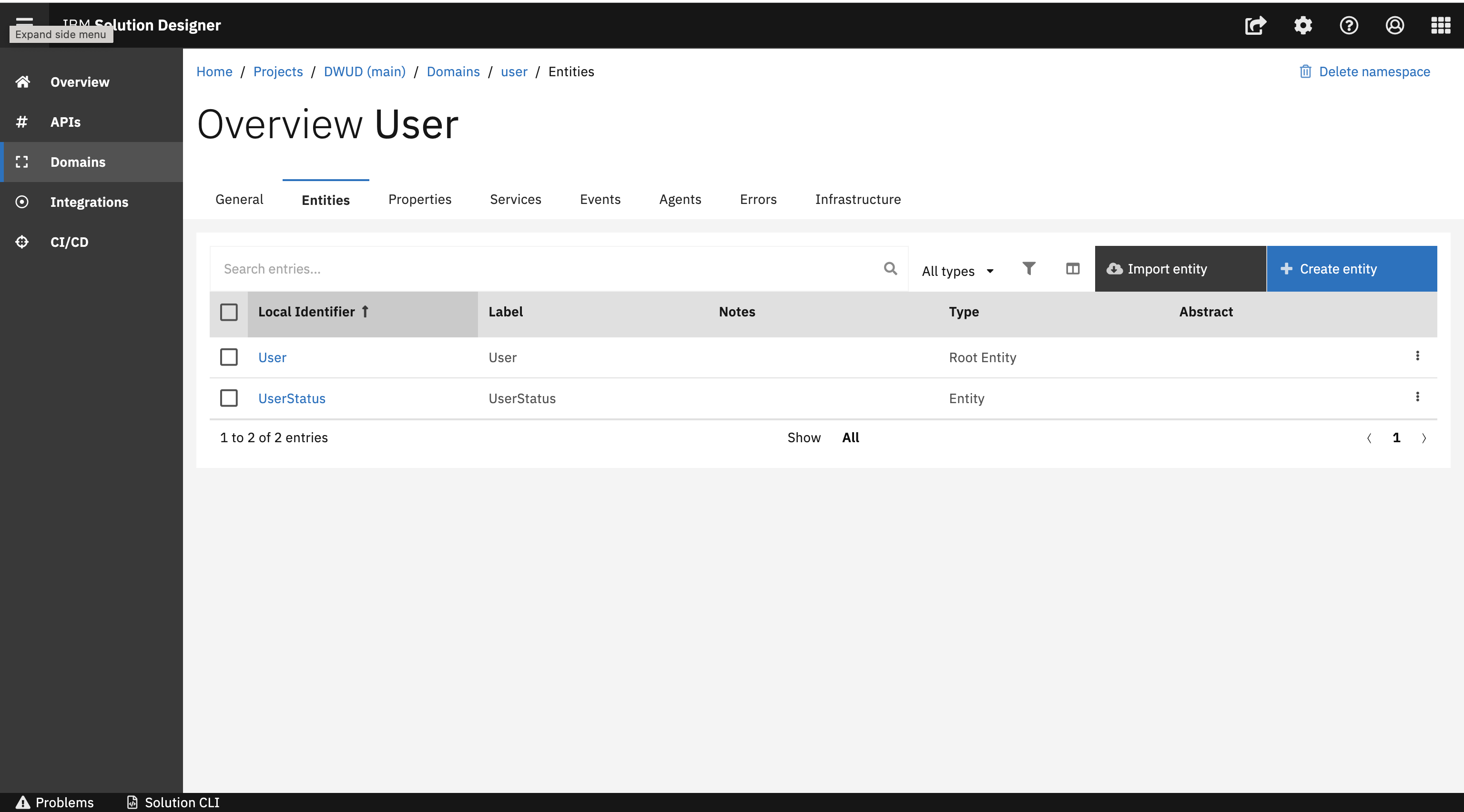 The two business analysts Jack and Alexander have designed all the important artefacts around the domain namespace. The domain namespace in the service holds several attributes like root entity, commands, business event and business error which manages the user information. Business events and business errors are used within the lifecycle of a user to change the status of a user.