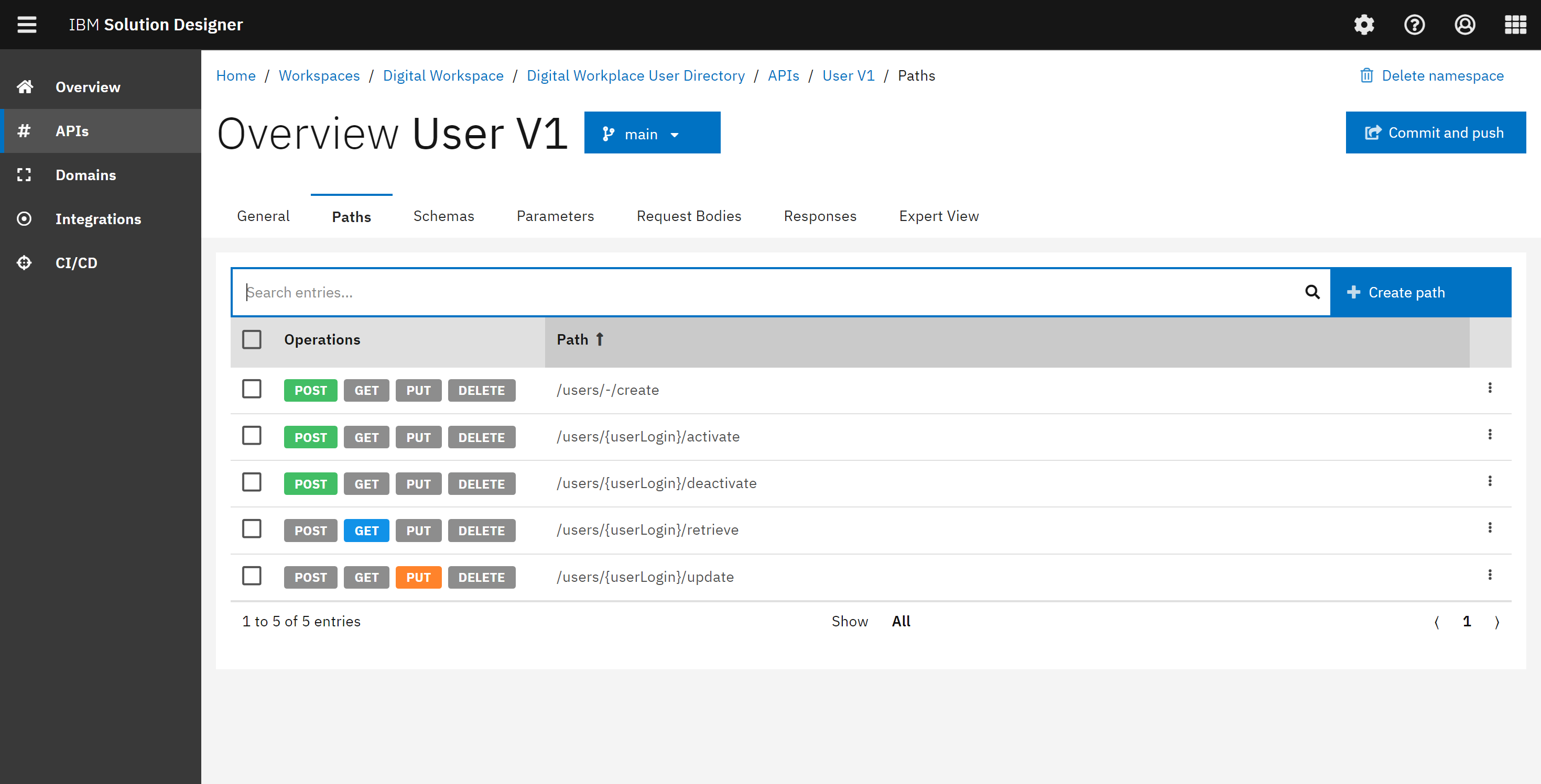 Jack designed several paths which can be performed as part of the API in the User Directory Service. Paths are typically provided as endpoints for APIs. For each path in the User Directory service, multiple operations can be created to perform the desired action based on the HTTP verb.