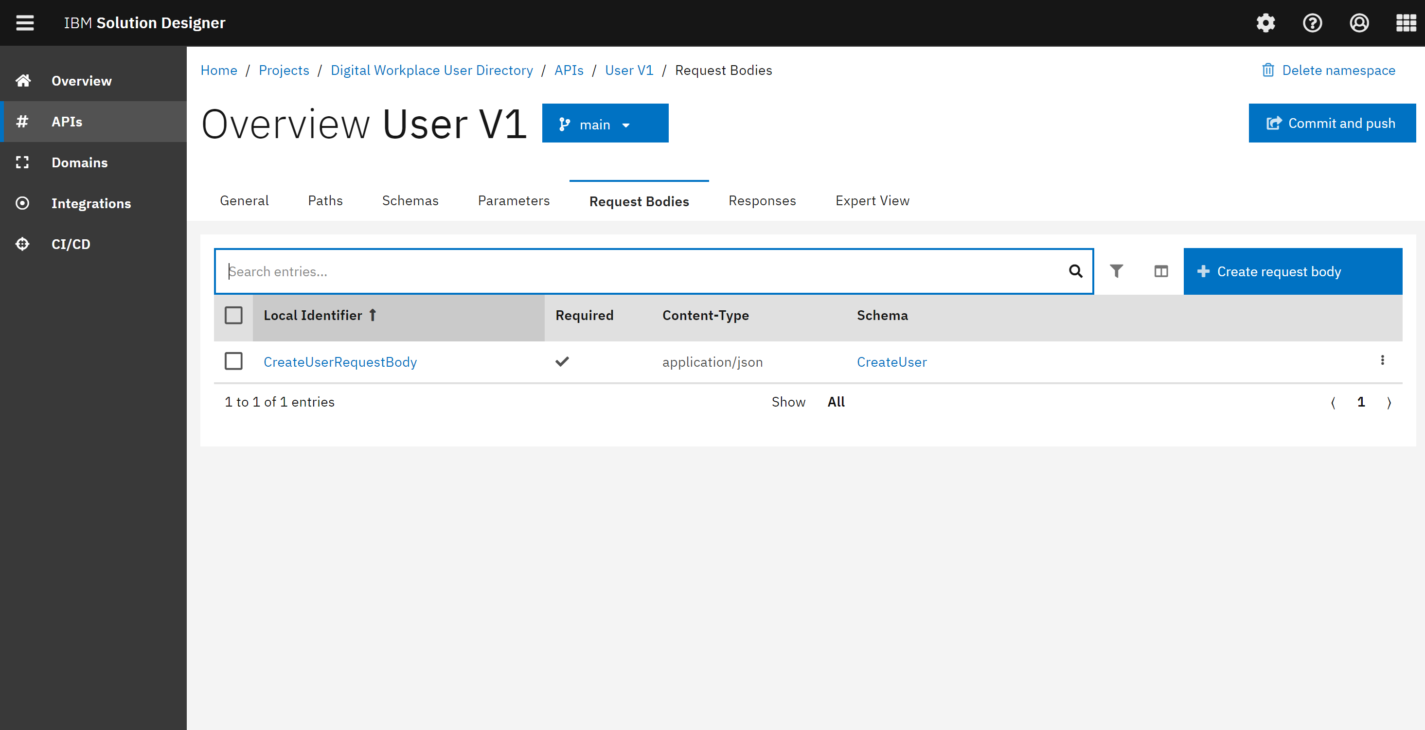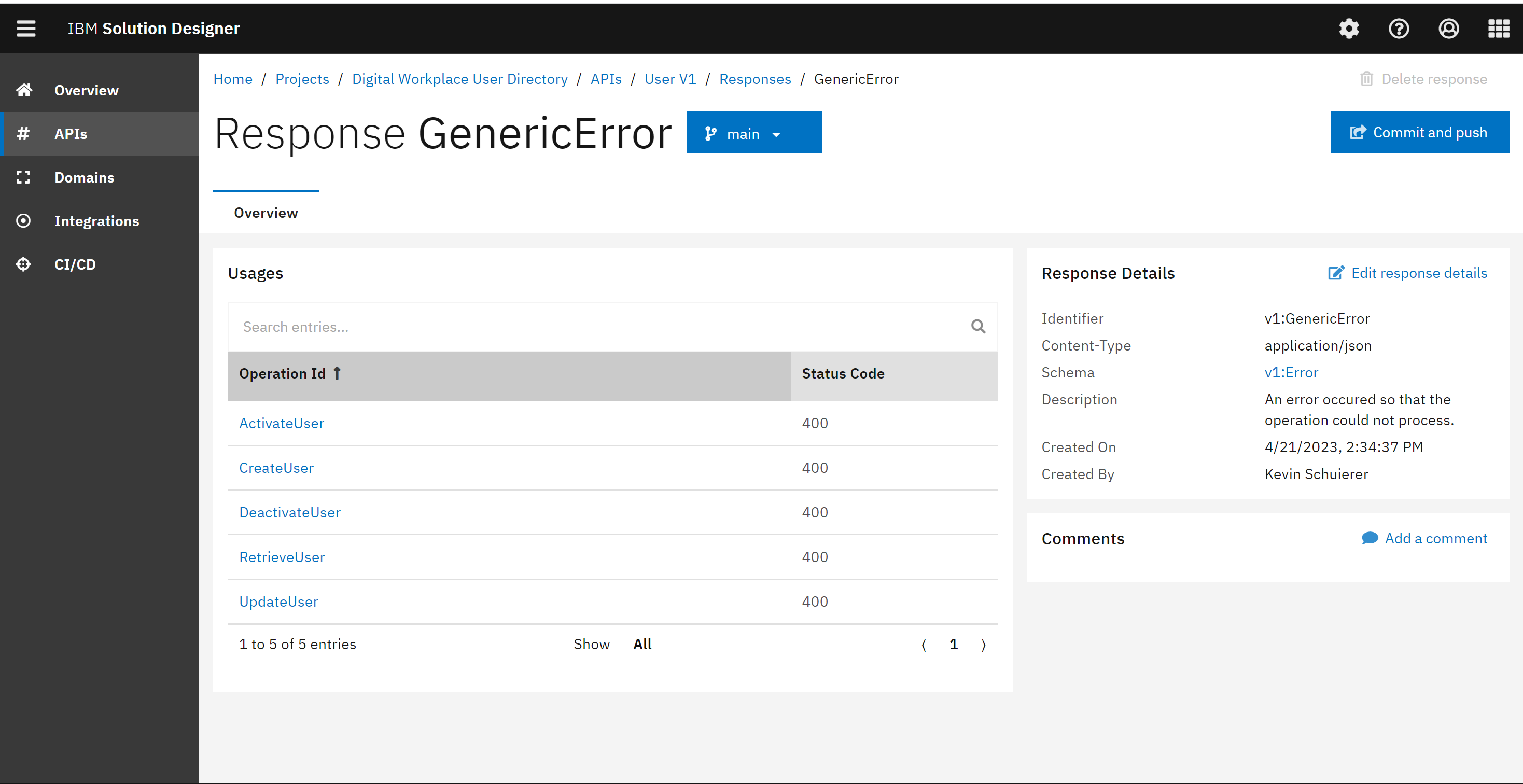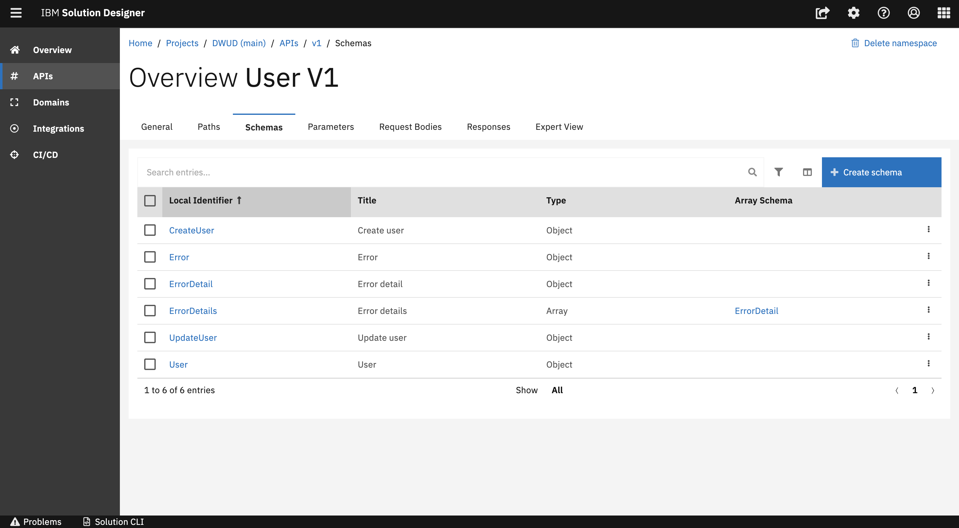 Jack has also designed schemas within an API namespace. A schema represents a data type of an API. The API namespace of the User Directory service contains Object schemas as well as Array schemas. In this service the CreateUser is a object schema which is considered as a complex schema as it holds the collection of properties. The service also contains ErrorDetails as an array schema which represents a list of error details. Schemas can be reused in multiple places in the API like request bodies, parameters and responses.