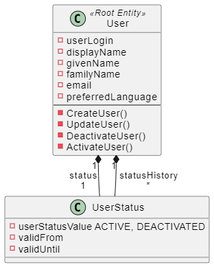 The User Directory service contains the single domain namespace User. As already mentioned in the context of the previous service, domains are used to encapsulate the business logic. The User Directory can be accessed through its root entity User and can be associated with other entities to form an aggregate.