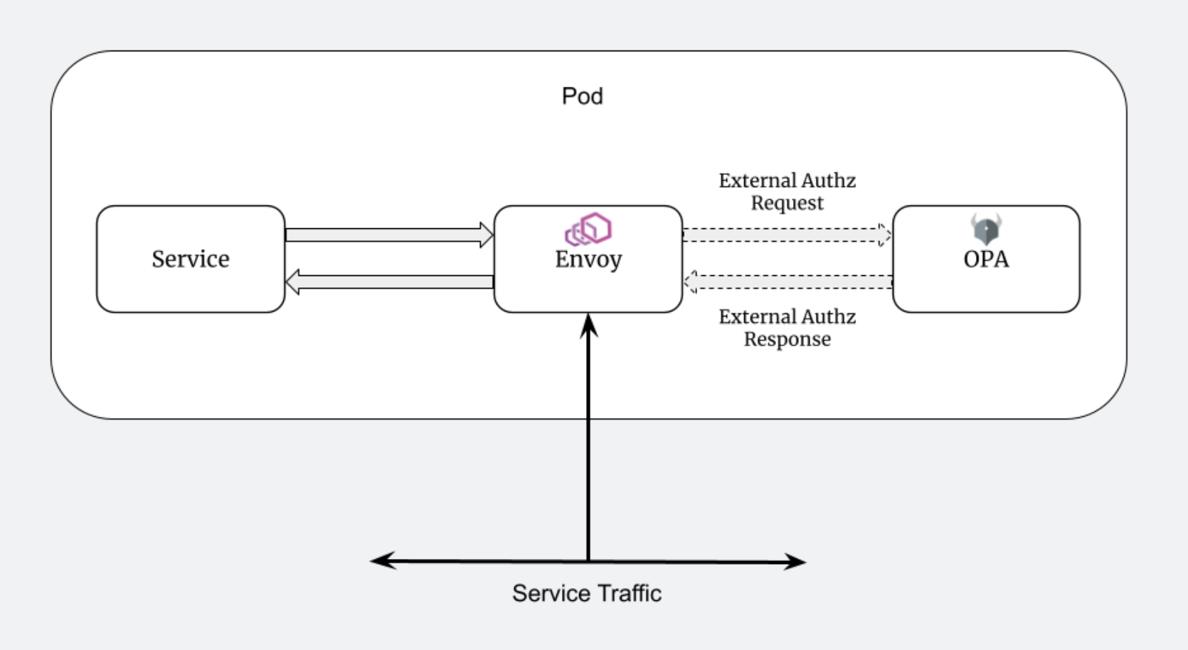 Requests are intercepted by Envoy, a lightweight proxy running as a sidecar. Envoy then queries OPA - running in another sidecar - to determine whether to allow or deny the request.